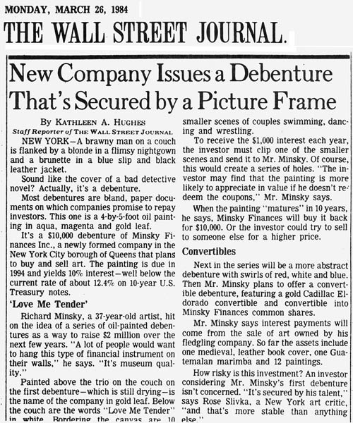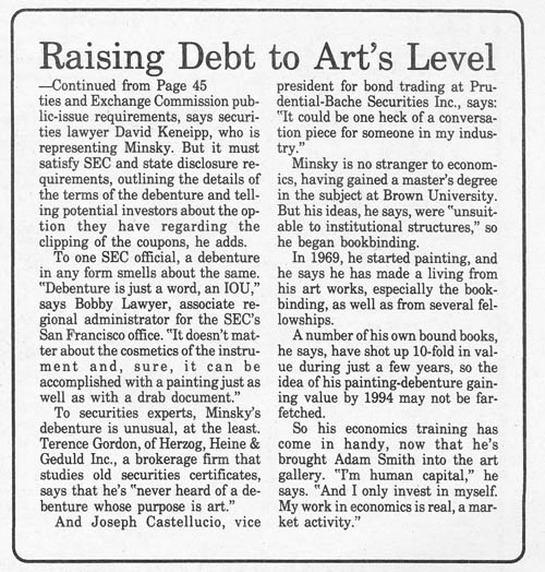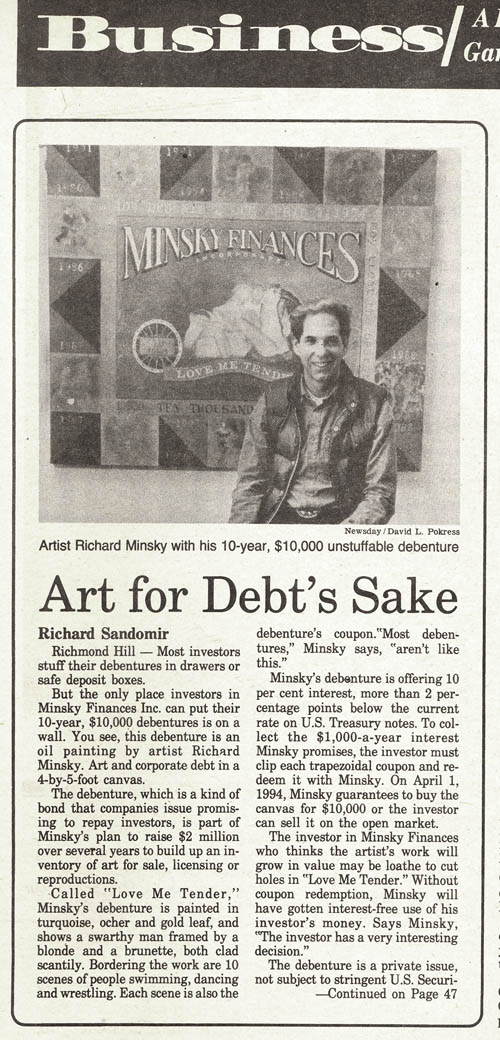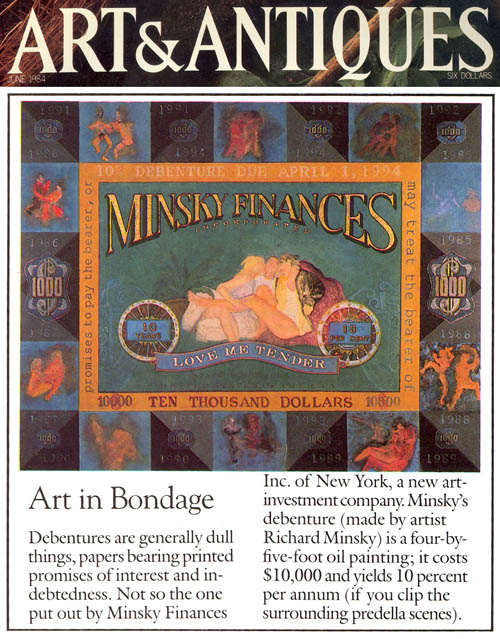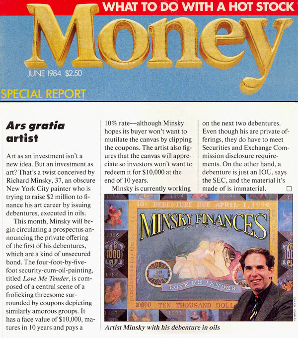 Because of his background in Economics and the Philosophy of Art, Minsky was asked many times to comment on several related issues of 20th century aesthetics: the relationship of the artist to the corporation, corporate art, and art as investment. After thinking about it for ten years, Minsky founded Minsky Finances Incorporated, a New York corporation, approved by the New York State Attorney General and the NY State Banking Department. The corporation itself was a work of art. It issued financial instruments which were works of art, including stock certificates and the above debenture. Instead of art as investment, Minsky made investments as art.The debenture was created as both a legal document, which was issued in accord with the regulations of the Securities and Exchange Commission, and as a work of art. As a debenture it was a coupon instrument of ten years at ten percent. In order to collect the interest, the bearer was required to cut one of the coupons (containing the predella scenes) from the debenture each year and redeem it for the interest payment. At the end of ten years, presentation of the central body of the instrument was required to collect the principal. The bearer therefore could have the painting as investment or art, but not both. This painting gathered an extraordinary amount of attention, with articles in The Wall Street Journal, Newsday, Money magazine and Art and Antiques (see the bibliography).