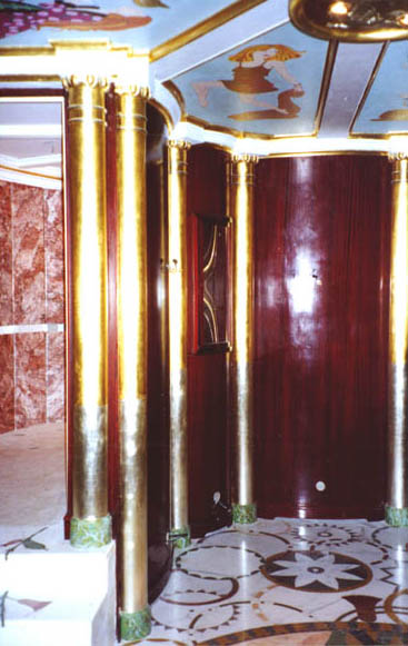 The bases are interpreted from green marble in the floor pattern, and above the column caps and along the ceiling molding is faux white marble.