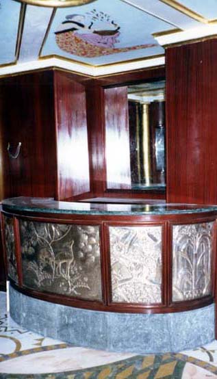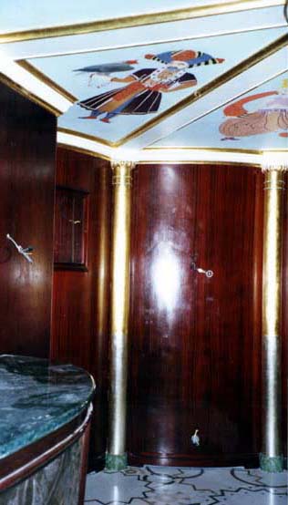 The feeling when you look up at the ceiling is that you are under water looking toward the surface, with its interplay of light and shadow. Fish are swimming in all directions. The painting was done by Minsky in a studio on the grounds of the Chateau while the ceiling to the left was being installed.