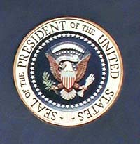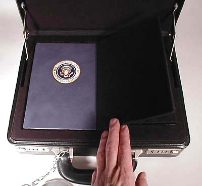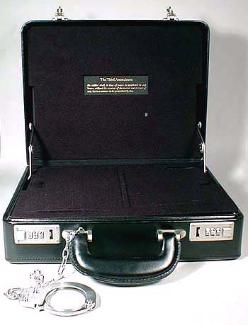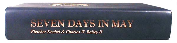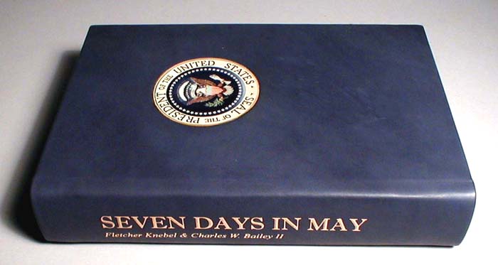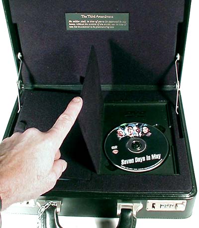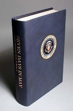 Issued December 27, 2001 The Third Amendment Seven Days in May by Fletcher Knebel and Charles W. Bailey, with a dvd of the film starring Burt Lancaster and Kirk Douglas, directed by John Frankenheimer. The Third Amendment sets a clear boundary on military authority. In this classic story the Chairman of the Joint Chiefs of Staff is seeking to quarter himself in The White House. Attaché Case: 12" x 14" x 4" (closed). The text of the third amendment is stamped in 23k gold on black board, in a recessed panel inside the felt-lined case cover. There are two compartments, for the book and dvd, each covered in black felt. The book is bound in blue calf with 23k gold title on spine. Inlaid seal is lacquered inkjet on Rives BFK mounted on 2-ply museum board. Endpapers are blue Canson Mi-Teintes.