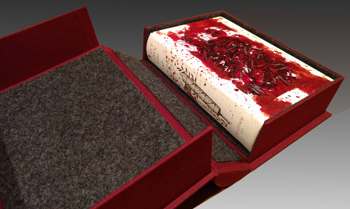Alum tawed goatskin, gold, panel of 8-point type, acrylic paint, artist's blood on Vermont Vigilance.