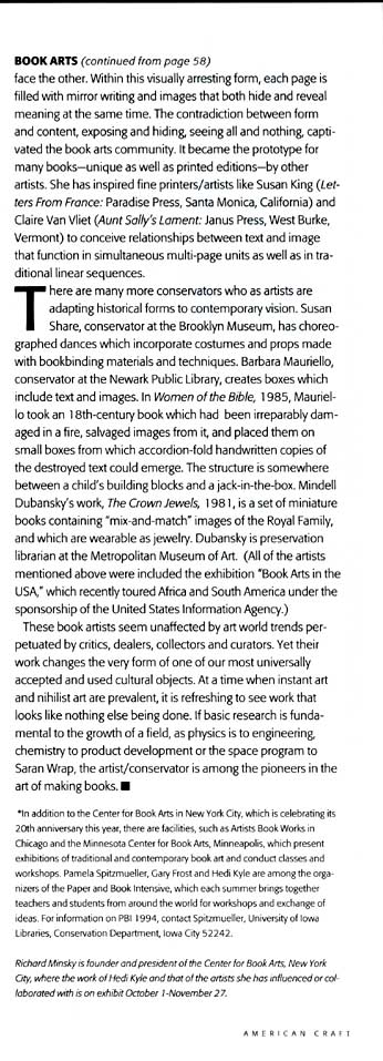 "Innovation from Tradition in the Book Arts" by Richard Minsky. American Craft, October/November, 1993
