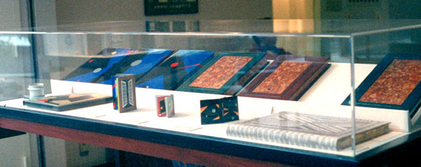 At the Richard Minsky 25-Year Retrospective Exhibition in 1992 sponsored by HarperCollinsPublishers, the exhibit case pictured below featured four lacquered bindings on blank books of handmade paper, three miniature books of studies for geometric binding designs, and a snakeskin binding. The bindings on the top left (blue and black) constitute a 3-volume set that creates a continuous design when the books are lined up with both covers open, in any order. The three on the top right are individual books in full leather bindings with inlaid recessed lacquer and gold leaf panels.