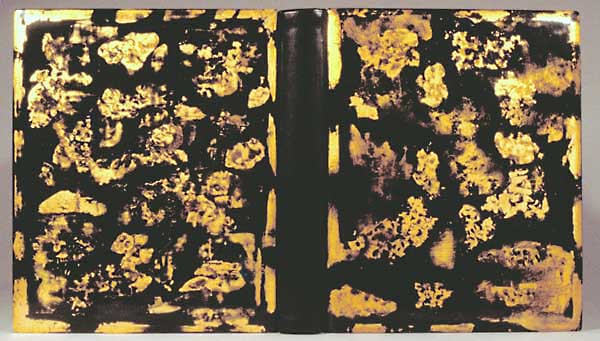 Album of hand-colored albumen prints. There are 35 layers of clear finishes, paint and gold leaf that create an optical effect of extraordinary depth. The photo above does not capture the subtle colors in the "black" areas, nor the illusionistic depth created by the light passing through many layers that refract it differently.