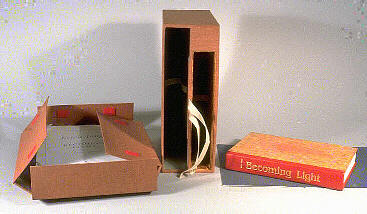 Binding includes back cover and spine in Nigerian goatskin, with a 23k gold stamped title. The front cover is a lacquered panel of acrylic over a photo of the author. The binding has a paper chemise which slides into a velvet lined double slipcase. The original typescript is in the other side of the slipcase, in a folder with Velcro closures. The inside of that part of the slipcase is paper lined, and has recesses for the flaps of the folder.