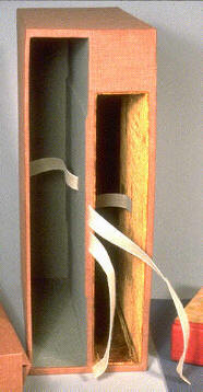 Note the linen tapes coming through the edge of the slipcase between the two openings. Pulling a tape advances the book or typescript from the case so the material may be removed from the case without removing the case from the shelf. This keeps the other books on the shelf from falling. Unlike ordinary tapes, these move through channels inside the boards, so when the book is removed the tape does not fall down, but remains in position ready to receive the book. Replacing the book in the slipcase pulls the tape back into the edge of the board.