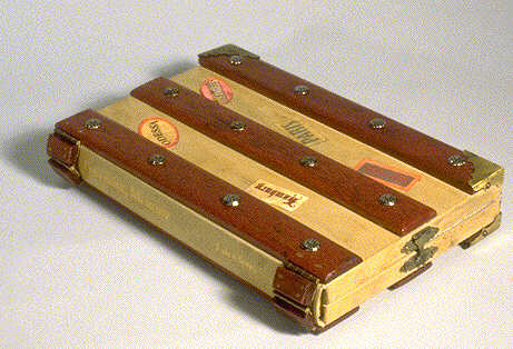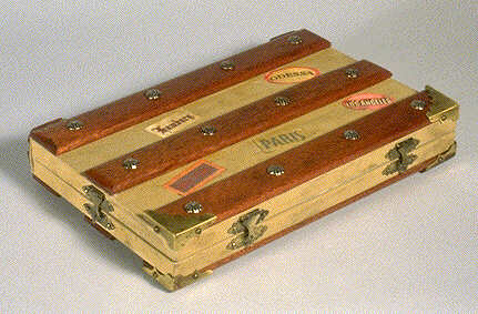 Varnished buckram, gold stamping, mahogany, brass hardware, wallpaper endsheets, inkjet labels.