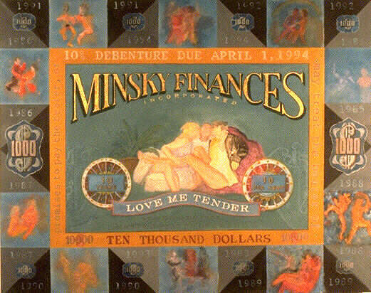 The debenture was created as both a legal document, which was issued in accord with the regulations of the Securities and Exchange Commission, and as a work of art. As a debenture it was a coupon instrument of ten years at ten percent. In order to collect the interest, the bearer was required to cut one of the coupons (containing the predella scenes) from the debenture each year and redeem it for the interest payment. At the end of ten years, presentation of the central body of the instrument was required to collect the principal. The bearer therefore could have the painting as investment or art, but not both. This painting gathered an extraordinary amount of attention, with articles in The Wall Street Journal, Newsday, Money magazine and Art and Antiques (see the bibliography).