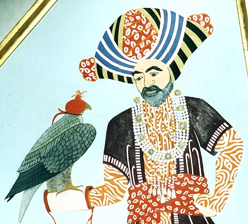 Below: There are eight ceiling panels, each with a life-size figure. Six are reproduced here. Barbara Slate drew and colored the original maquettes, and Richard Minsky executed the paintings in oil on Belgian linen with gold and white gold leaf. The paintings were done in the Minsky studio on Bleecker Street in New York and shipped to France, where they were installed by an expert marrouflage technician. Click on any picture to see larger full views and details.