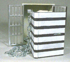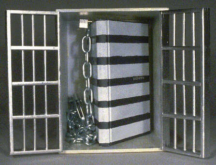 Chain binding with handcuffs and padlock, painted in acrylic prison stripes over publisher's binding, with isbn number stamped in hologram foil, in a case with jail doors. Acrylic/latex over wood. The book was published by G.K. Hall in 1990.