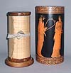 Bound as a scroll. Papyrus endpaper printed inkjet with reproduction of Sappho text from early scroll fragment. Wood endcaps with oil base stain, 23K gold leaf, polyurethane and lacquer. Inset brass bushing for cedar scroll handle, which is contained in scroll center under removable endcap. Wood base with, stain, polyurethane and lacquer. Scroll cover is lacquered inkjet adapted from Greek Krater image of Alcaeus and Sappho.