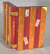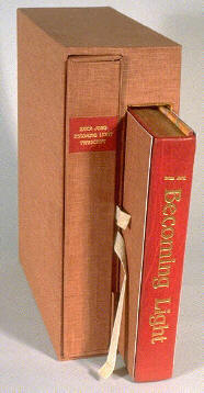Binding includes back cover and spine in Nigerian goatskin, with a 23k gold stamped title. The front cover is a lacquered panel of acrylic over a photo of the author. The binding has a paper chemise which slides into a velvet lined double slipcase. The original typescript is in the other side of the slipcase, in a folder with Velcro closures. The inside of that part of the slipcase is paper lined, and has recesses for the flaps of the folder.