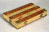 Binding in the style of a writing-box. Wood and wood veneers stained to a cherry-mahogany hue, inset leather panel.